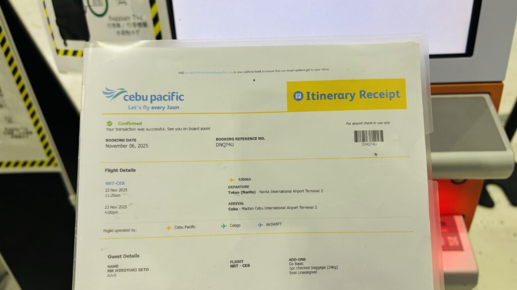 成田〜セブの直行便が飛ぶようになったので、マニラ経由でセブに行く方はほとんどいないと思いますが、1つの予約番号で成田→マニラ→セブの航空券を購入している場合には、成田空港でチェックインの際は