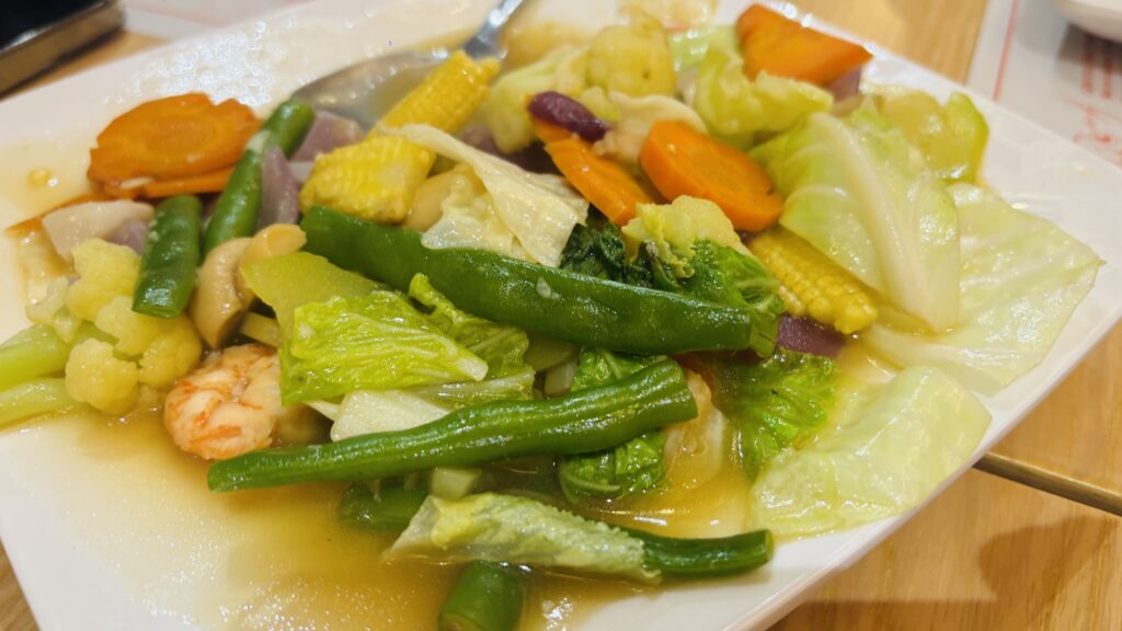 旅行中は野菜が不足しがちですが、『チョップスイ(八宝菜風炒め)』があれば安心!