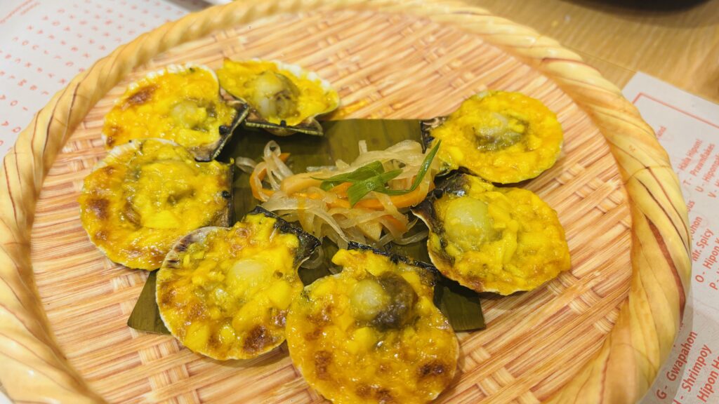 ホタテにバターとチーズ、ガーリックを乗せて焼き上げたメニュー。