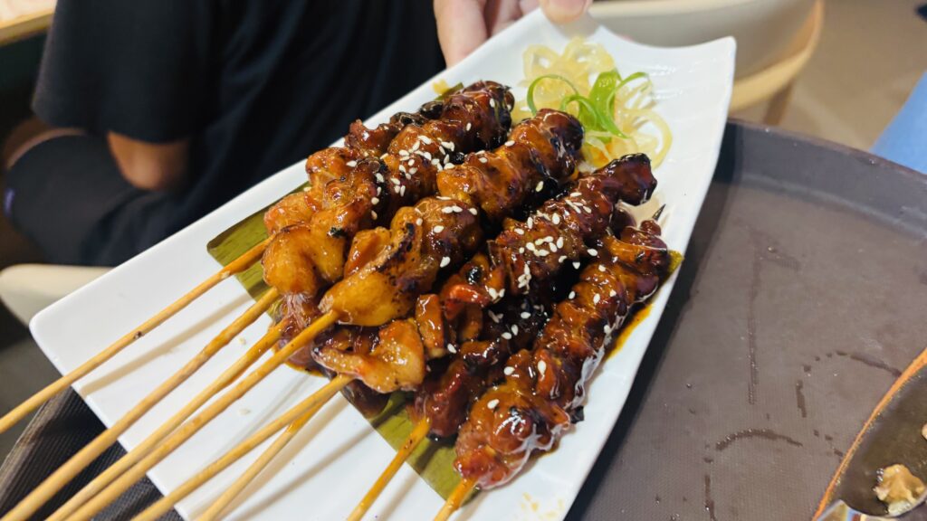 日本の焼き鳥のような甘辛いタレがたっぷり絡んでおり、炭火の香ばしさがたまりません。