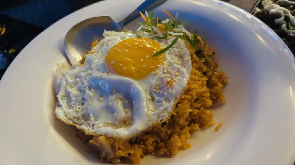 目玉焼きがのったキムチチャーハン。ピリ辛でしっかり味がついている。