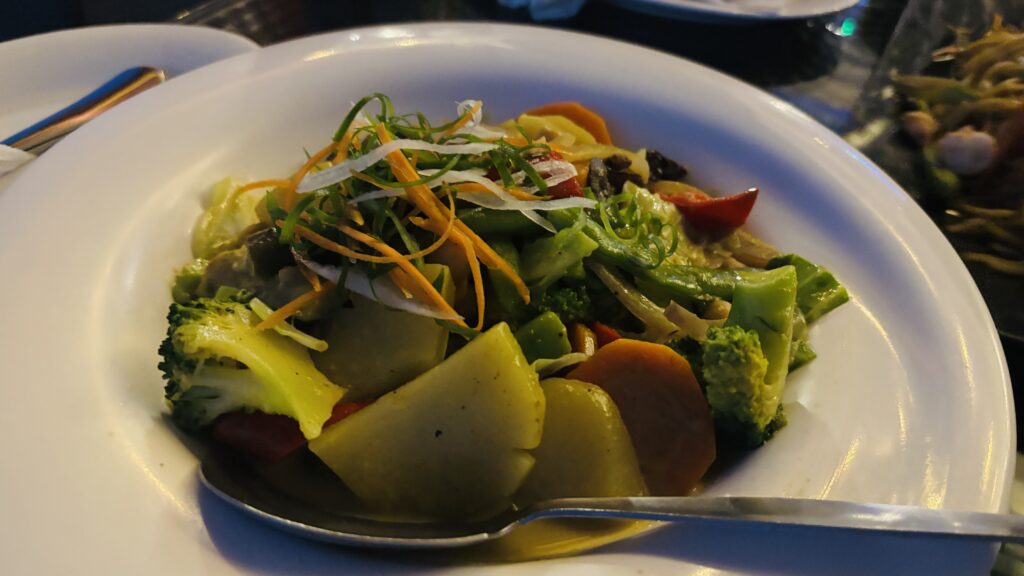 ブロッコリーやニンジンなど野菜がゴロゴロ。カレーの味付けでスパイシーすぎない。
