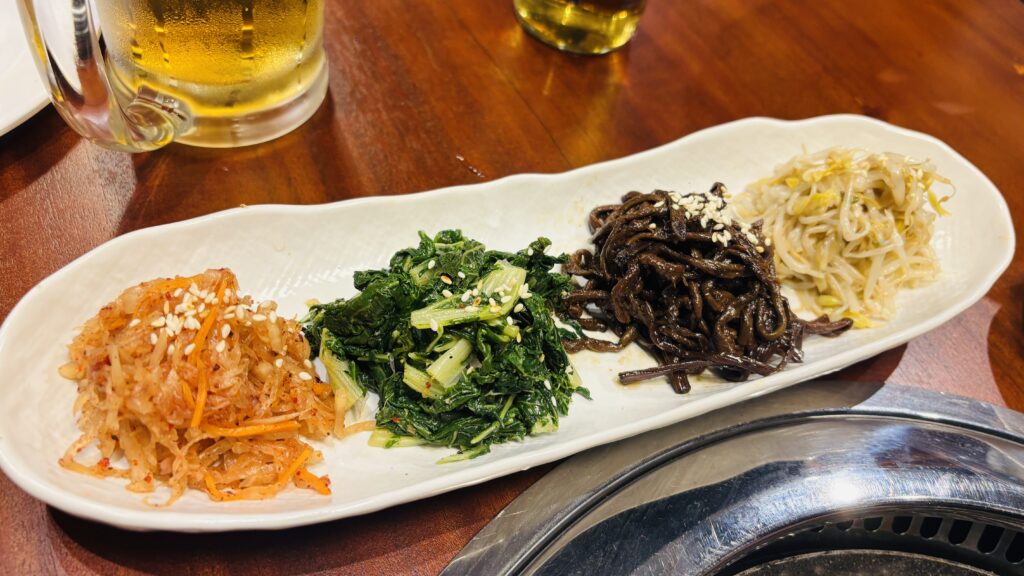 最初に出てきたのはナムル4種盛り。キムチ、ほうれん草、きゅうり、ぜんまい、もやし。ビールとの相性が抜群です。