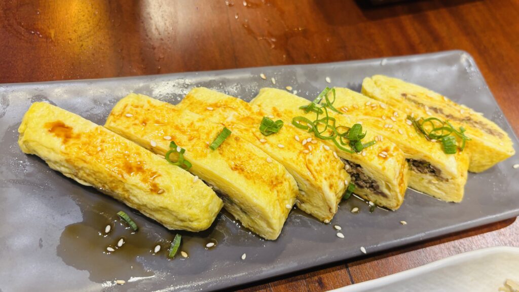 ふわふわの玉子焼き。中にはひき肉の具が入り、ネギとゴマがトッピングされています。出汁の効いた味わい。