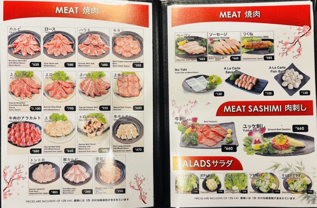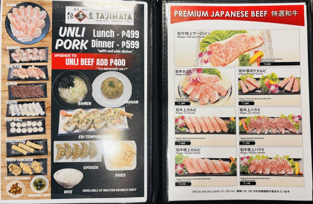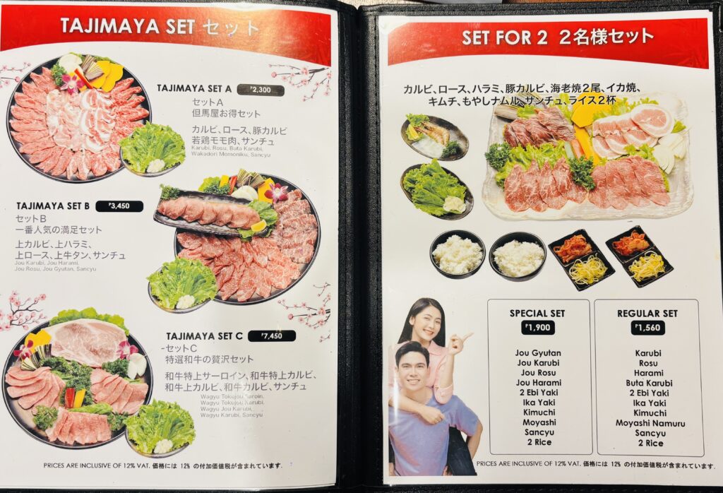 食べ放題なら豚499ペソ〜。ランチセットは250ペソ〜。特選和牛のセットも3,300ペソから用意されています。予算に合わせて楽しめるのが但馬屋のいいところです。