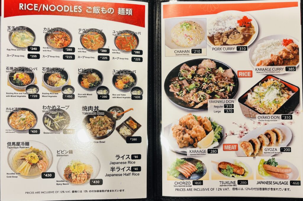 250〜280ペソでランチが食べられます。焼肉店のラーメンセットが約700円。気軽に立ち寄れる価格です。