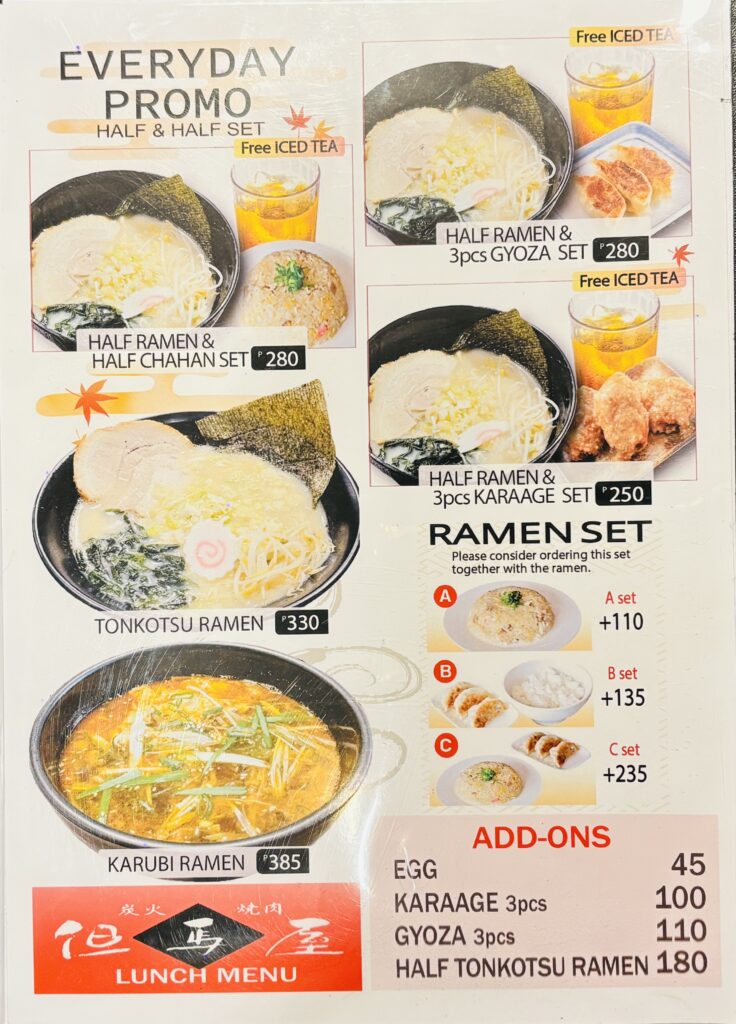 - ハーフラーメン+から揚げ3個セット:250ペソ(アイスティー付き)