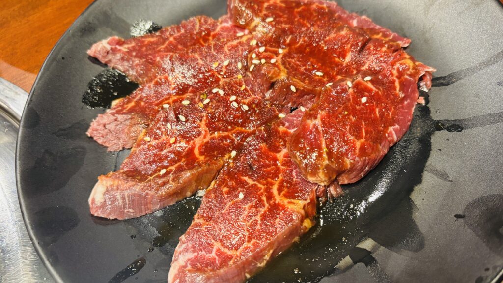 メインの焼肉がどんどん運ばれてきます。サシの入った美しいカルビ。赤身の旨みが詰まったハラミ。どの肉も鮮度が高いのが見た目でわかります。